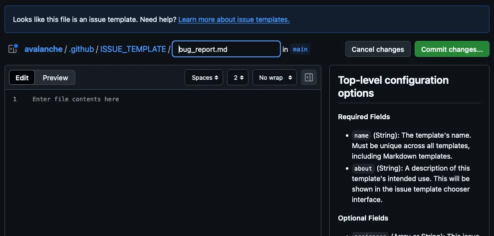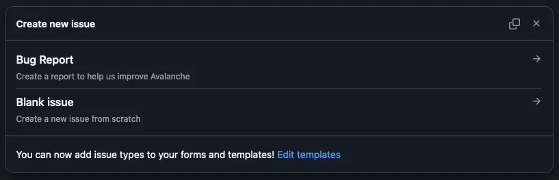 bug_report.mdfile, and customize it as needed. This template includes key fields that help contributors provide a detailed bug report:.github/ISSUE_TEMPLATE/bug_report.md ---name: Bug Reportabout: Create a report to help us improve Avalanchetitle: "[BUG] "labels: bugassignees: ""---**Describe the bug**A clear and concise description of what the bug is.**To Reproduce**Steps to reproduce the behavior:1. Go to '...'2. Click on '...'3. Scroll down to '...'4. See error**Expected behavior**A clear and concise description of what you expected to happen.**Screenshots**If applicable, add screenshots to help explain your problem.**Environment:**- OS: [e.g. iOS]- Browser [e.g. chrome, safari]- Version [e.g. 22]**Additional context**Add any other context about the problem here. -